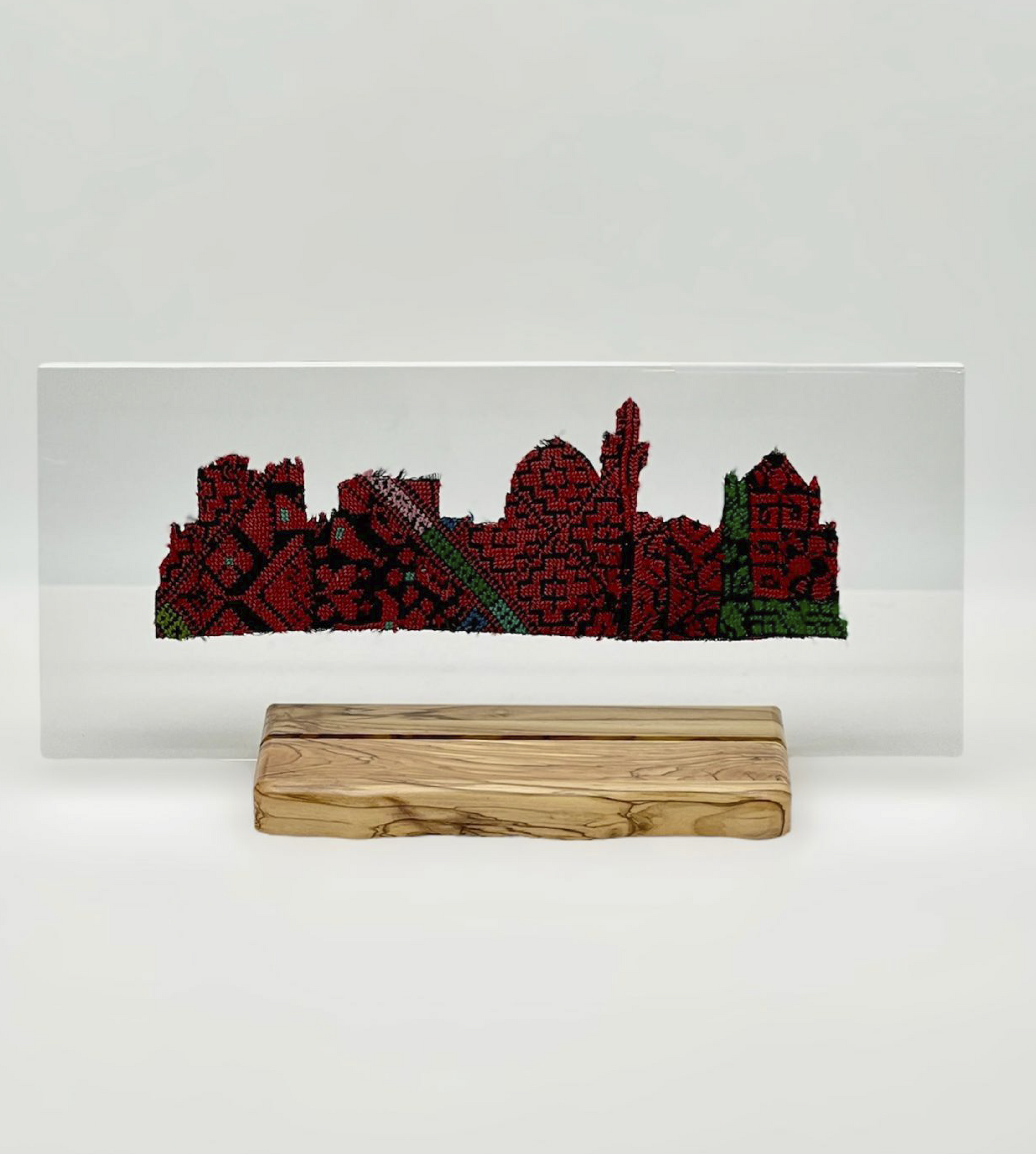 Jerusalem Old City Skyline on Acrylic with Olive Wood ,Ramallah embroidery