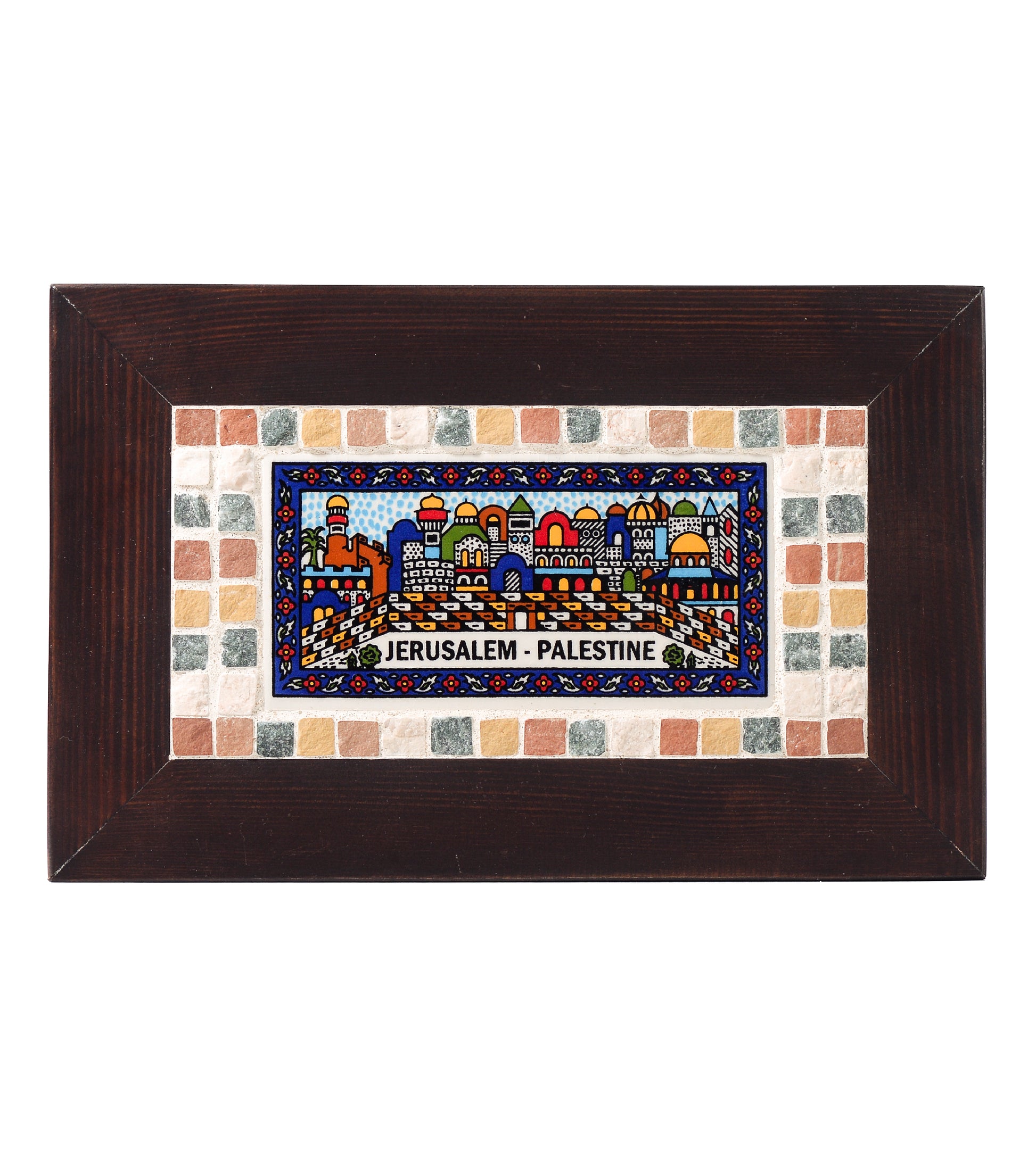 handmade piece that uses a mixture of Palestinian embroidery , wood, and a Palestinian mosaic that have been found in the mountains of Palestine.