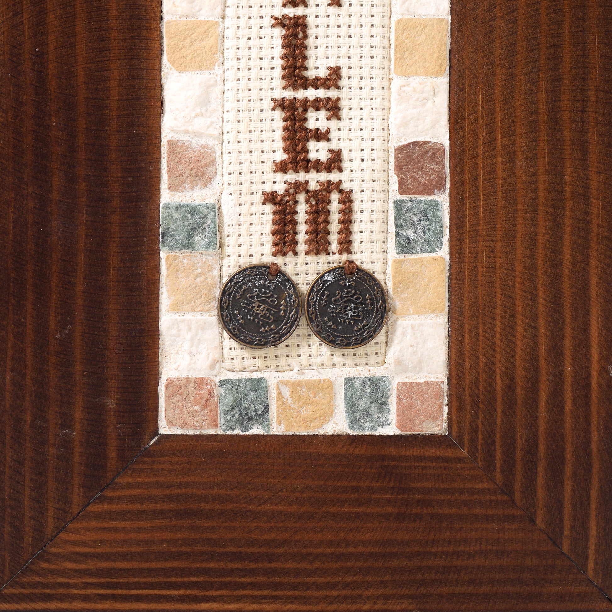A handmade piece that uses a mixture of Palestinian embroidery , wood, and a Palestinian mosaic that have been found in the mountains of Palestine.