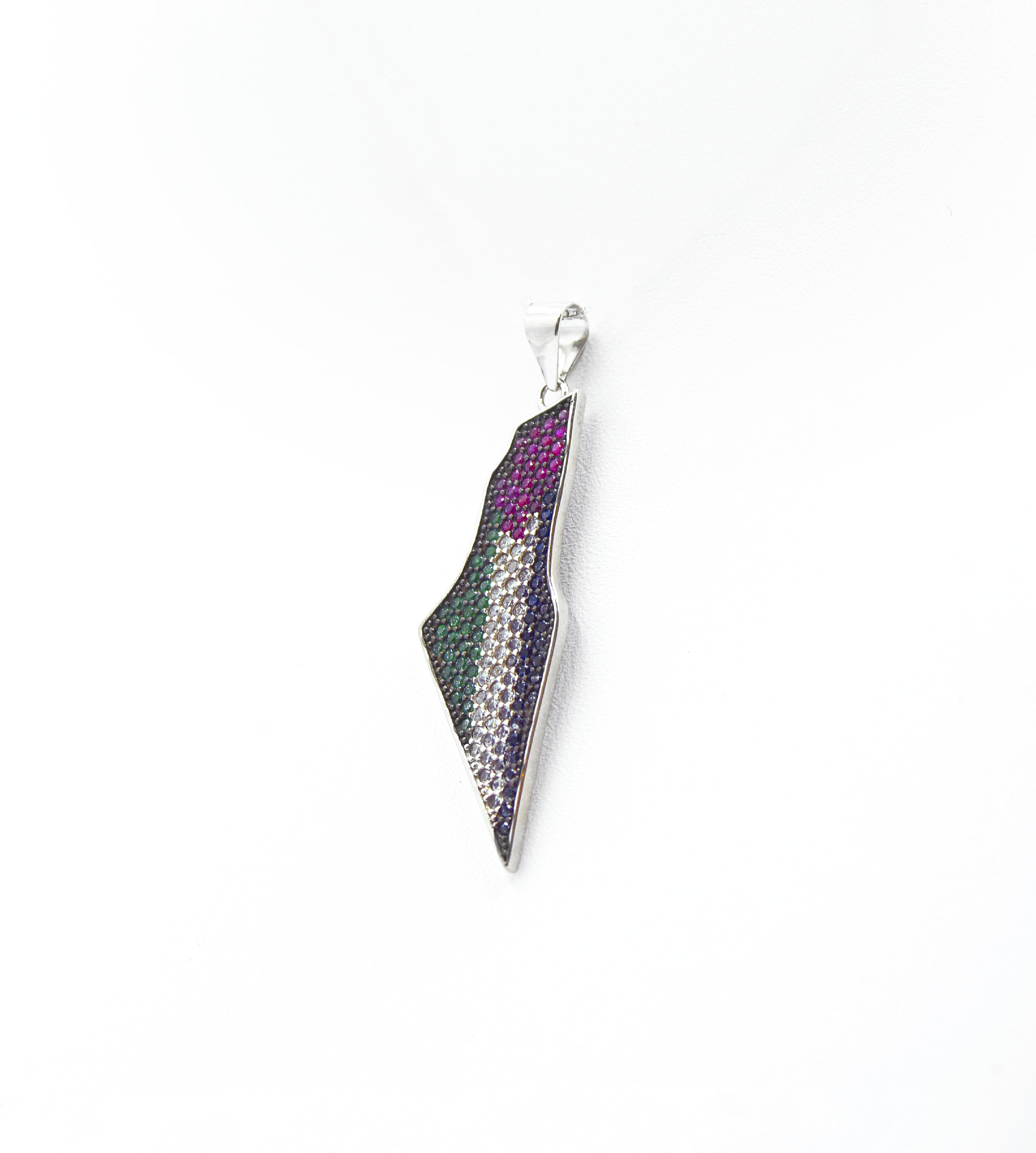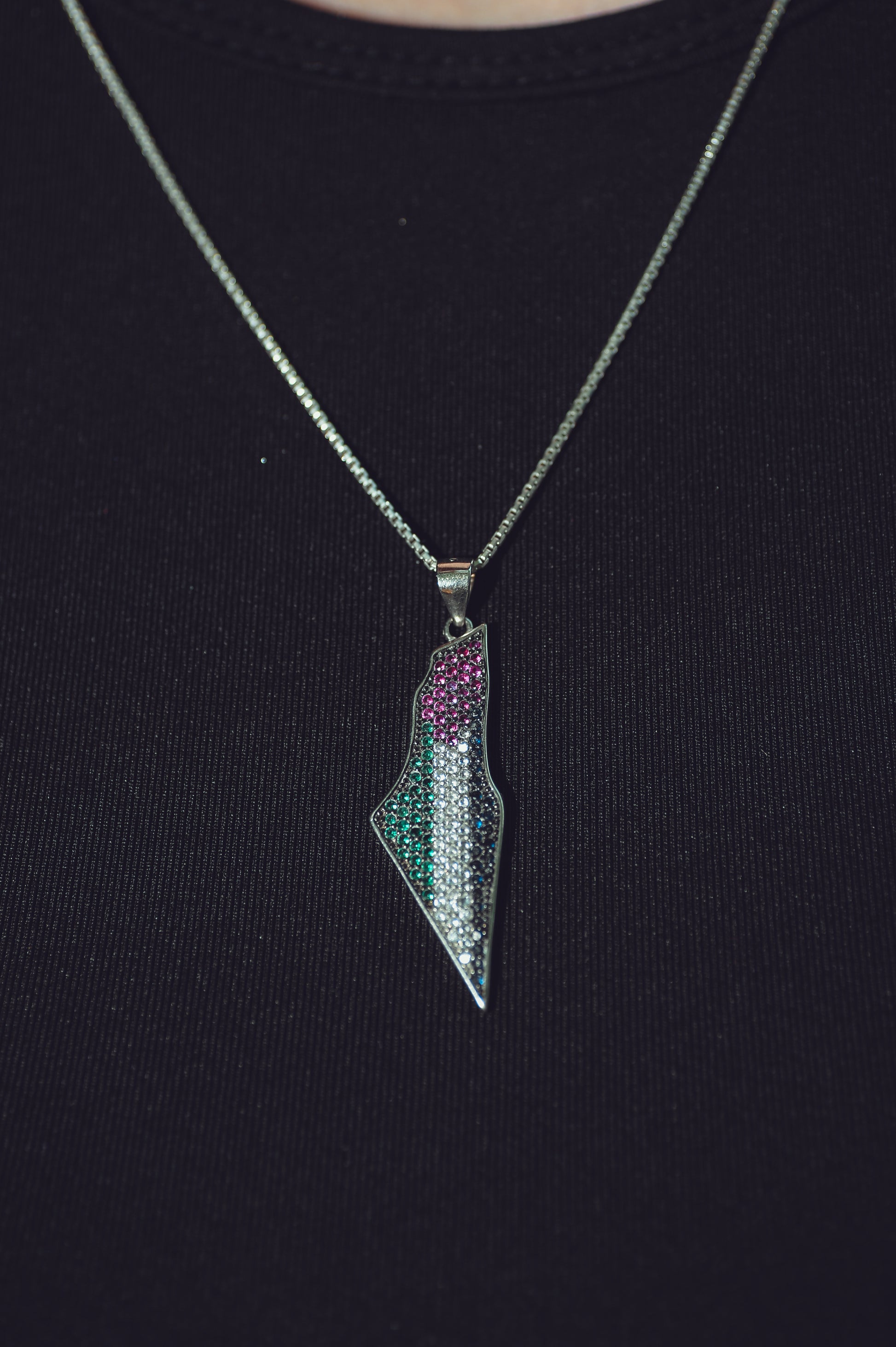 A Beautiful handmade pendant featuring the Palestinian flag designed in the shape of the map of Palestine. Made from high-quality 925 silver.