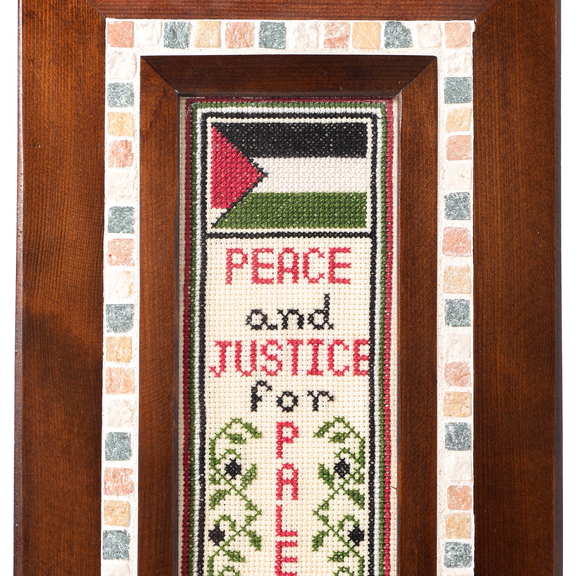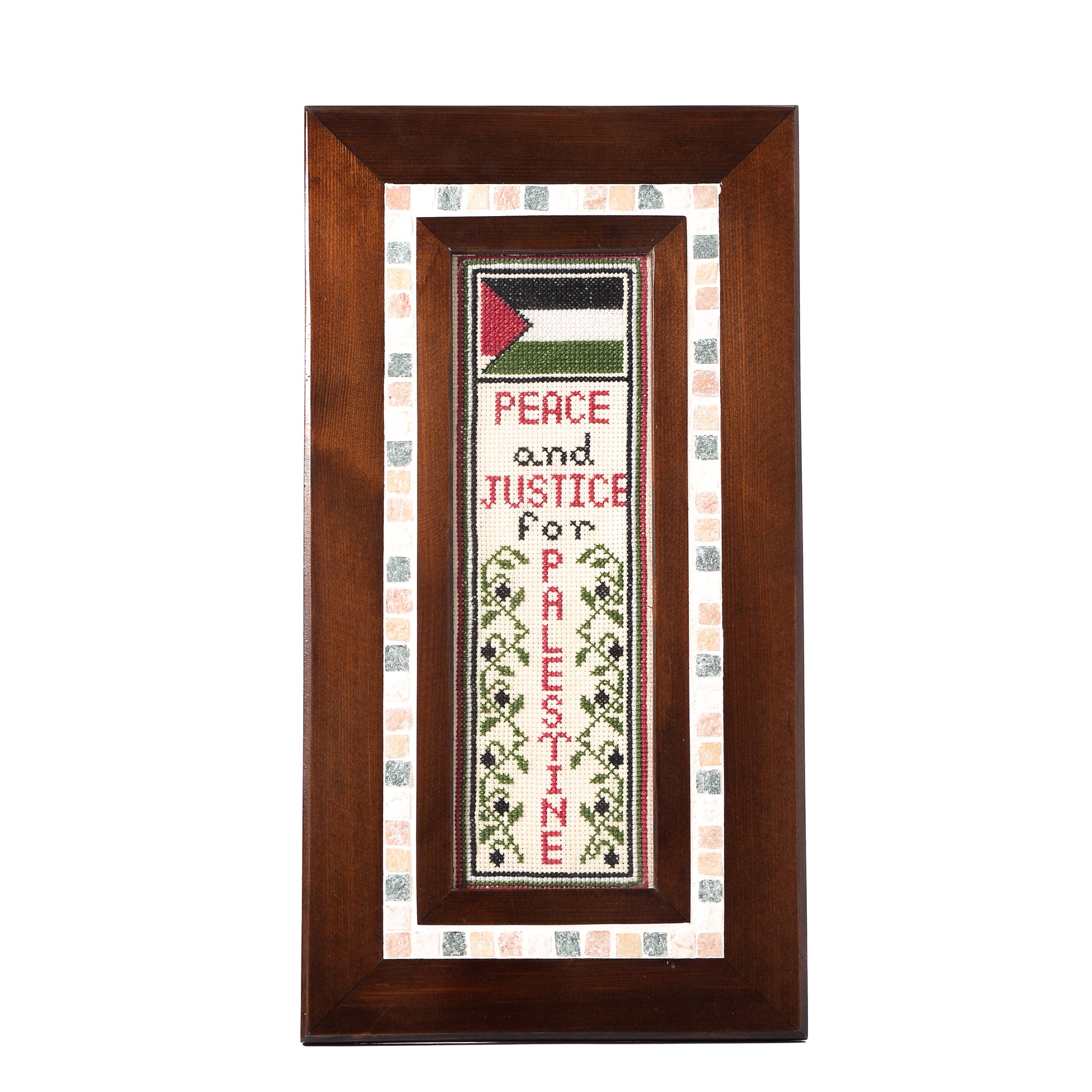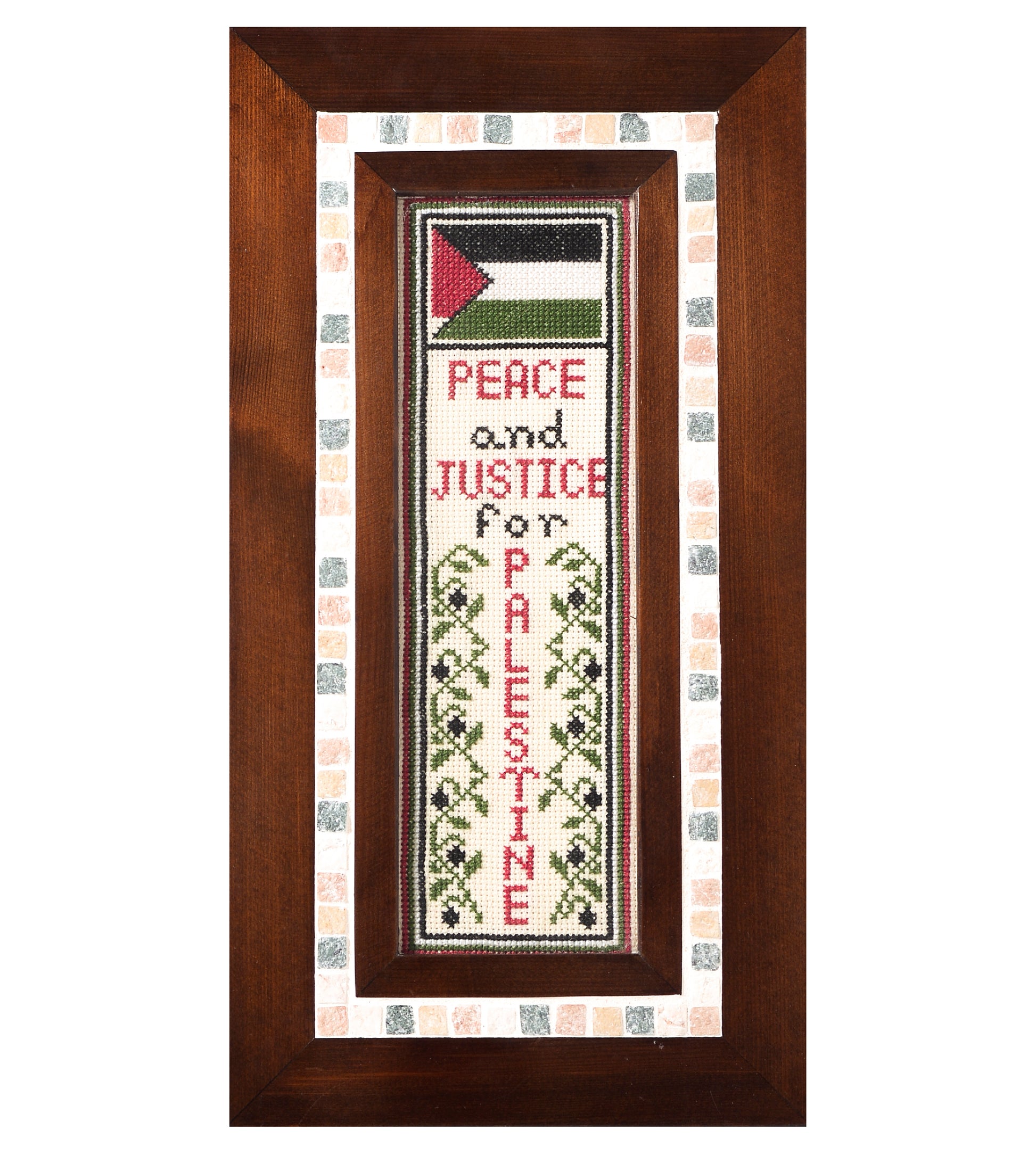 A handmade piece that uses a mixture of Palestinian embroidery , wood, and a Palestinian mosaic that have been found in the mountains of Palestine.