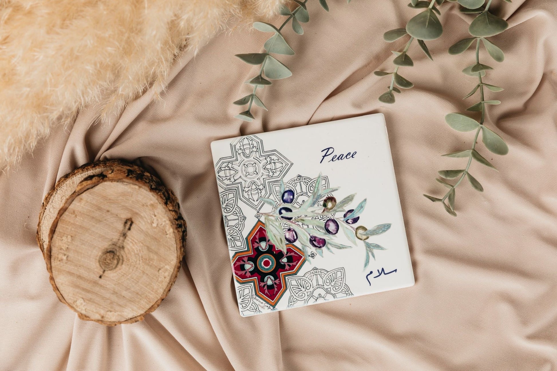 This ceramic coaster features a sublimation-printed design with decorative patterns and is backed with a natural absorbent cork base.