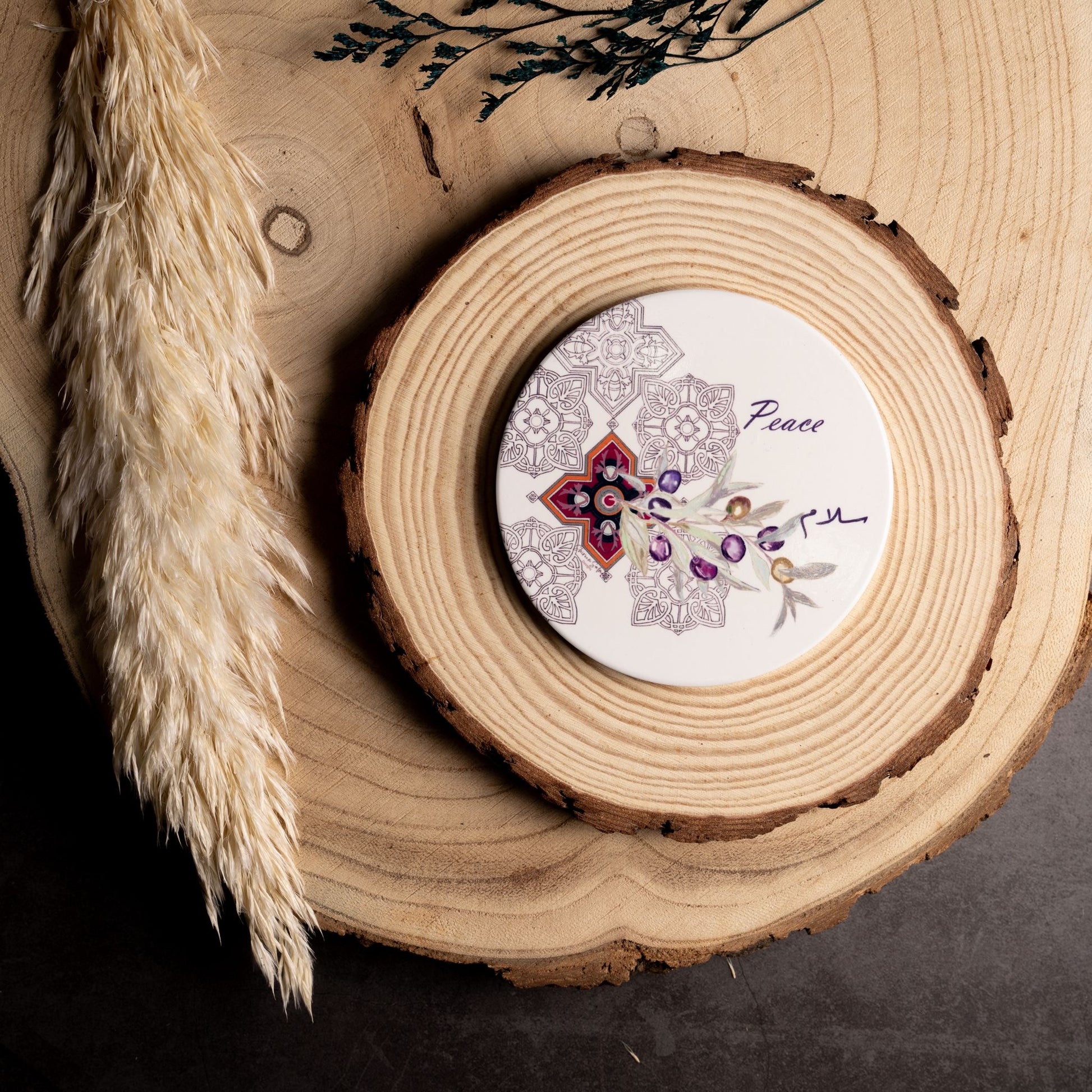 This ceramic coaster features a sublimation-printed design with decorative patterns and is backed with a natural absorbent cork base.