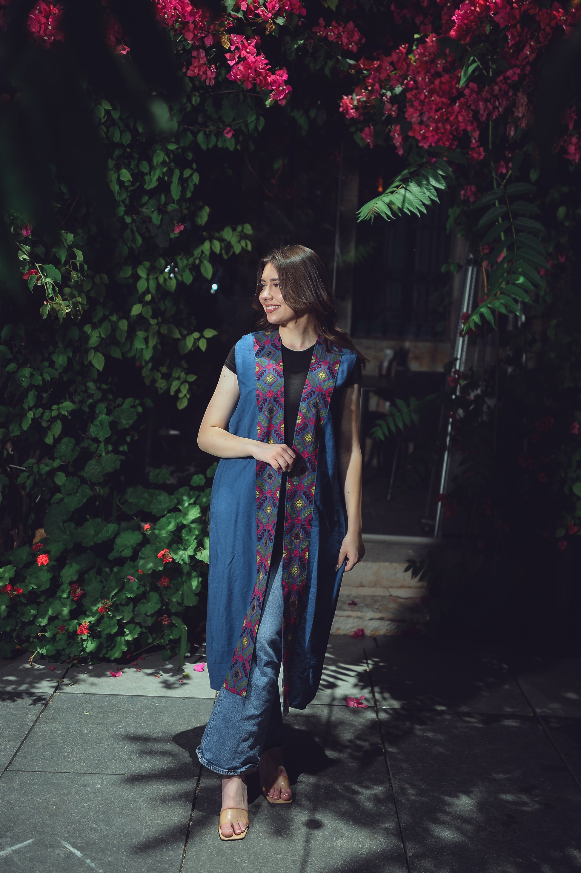 This long blue vest features beautiful, hand-embroidered designs on the front — using vibrant colors and traditional Palestinian stitches. The intricate patterns add a touch of culture, identity, and craftsmanship to any outfit.