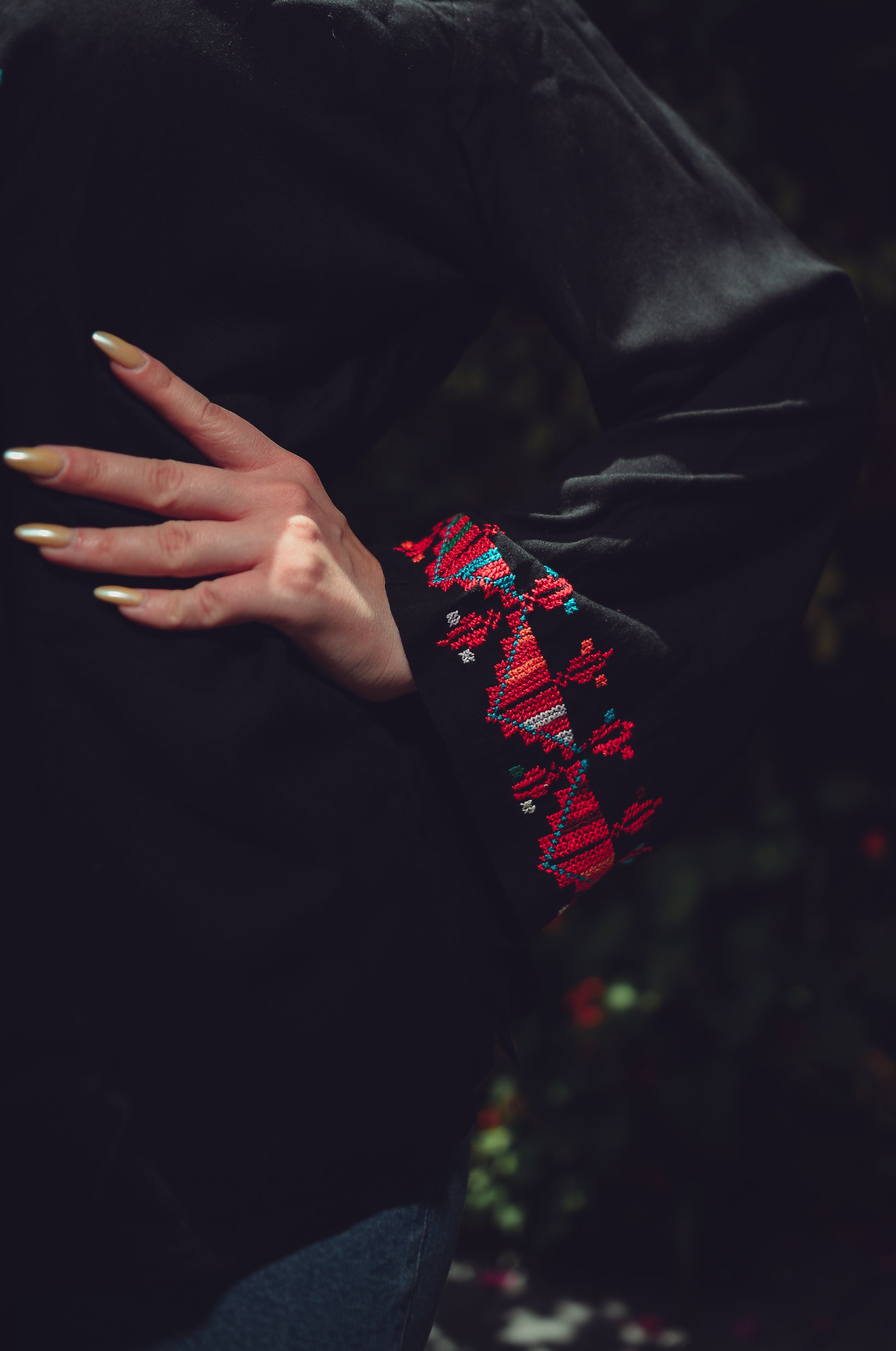 This soft black cotton blouse features a hand-embroidered Gaza Tatreez “Qilada” (قلادة) motif on the collar — a beautiful and iconic design symbolizing Palestinian heritage and craftsmanship.