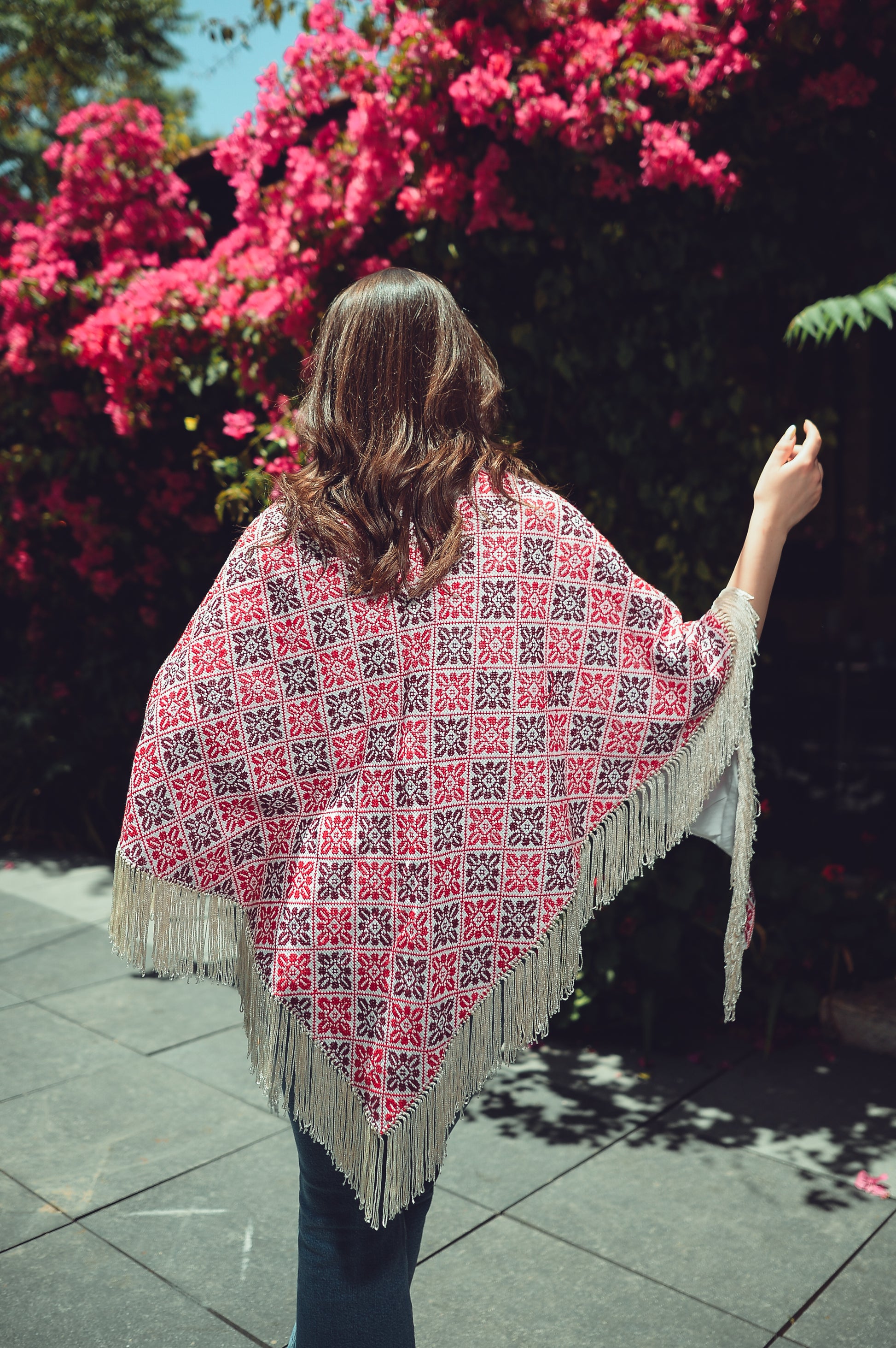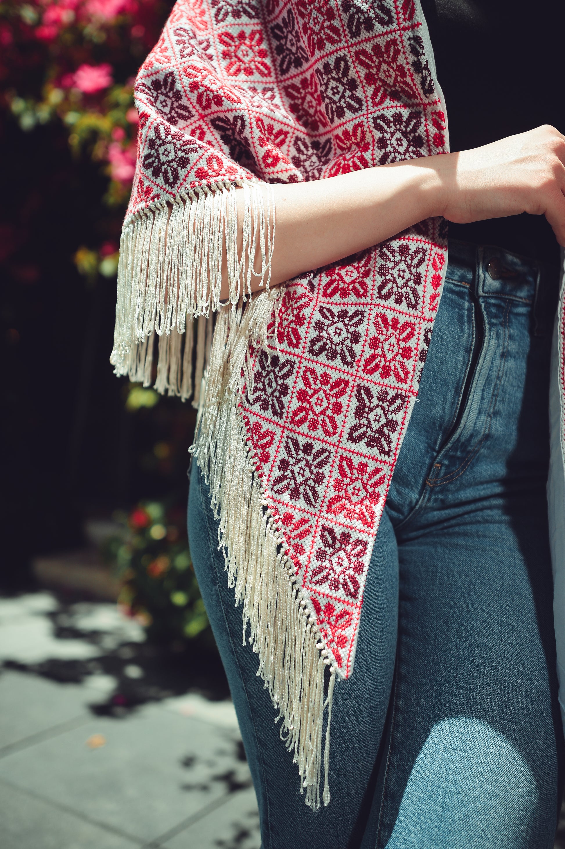 Refined simplicity, rooted in heritage. An elegant triangular white shawl, crafted from traditional Aida (Etamine) fabric, known for its soft texture and perfect structure for detailed embroidery. Adorned with hand-stitched Palestinian motifs, it offers a subtle yet striking way to celebrate culture.