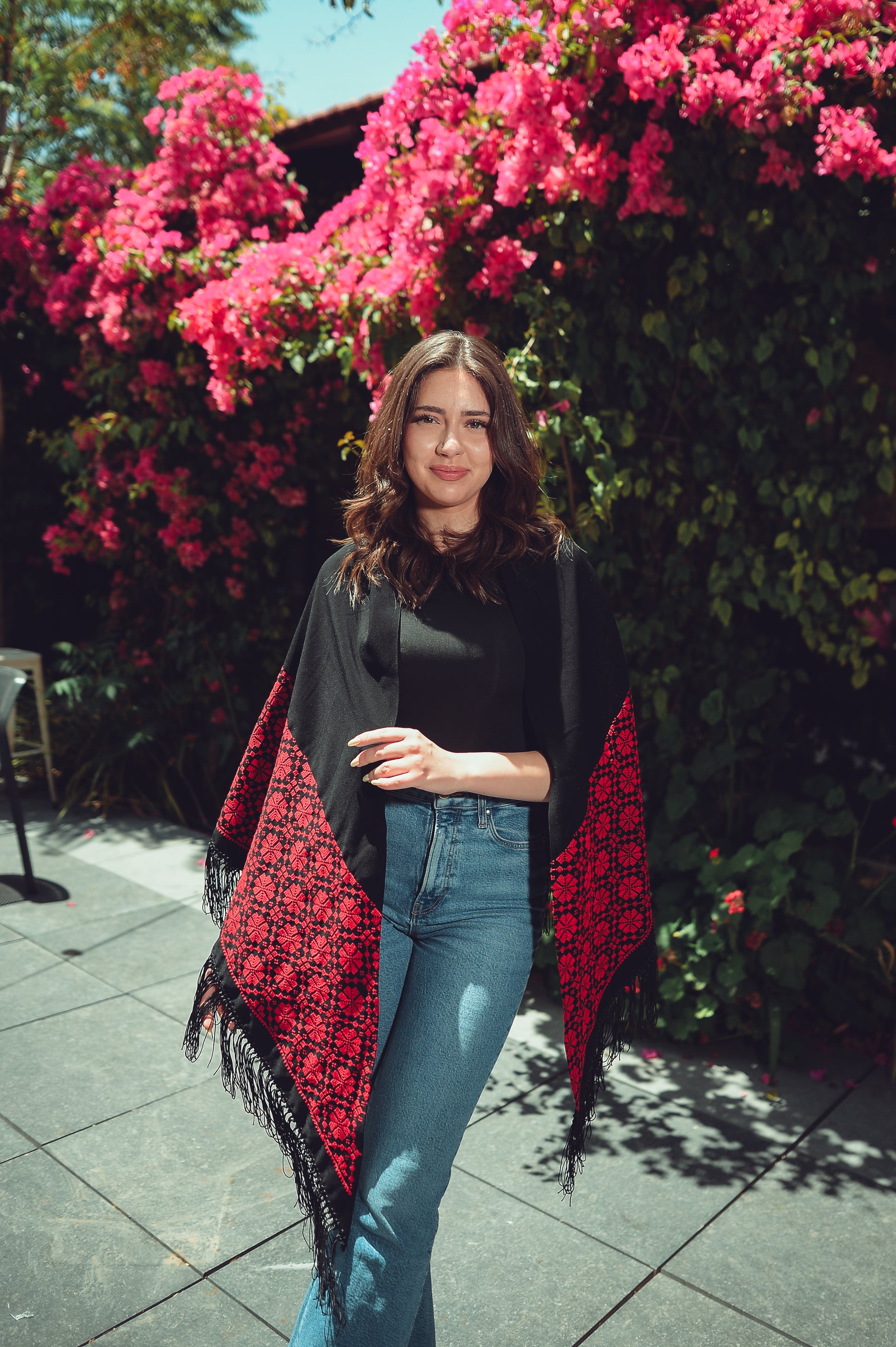 A graceful fusion of tradition and elegance. A triangular shawl, crafted from lightweight crepe and beautifully adorned with traditional Palestinian hand embroidery. The perfect statement piece for weddings, special occasions, or to elevate any look with cultural depth.