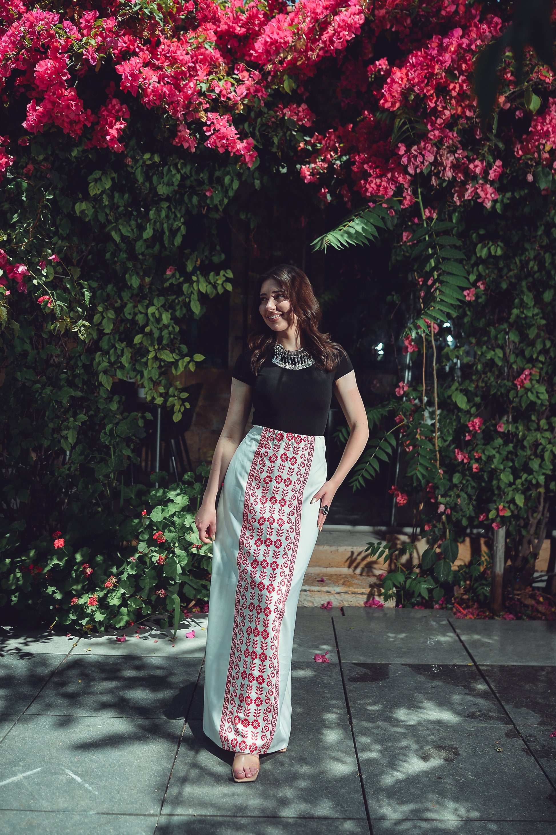 This white skirt features a bold vertical red embroidery line at the front, combining simplicity with the richness of tradition. The contrast of red on white reflects the heart of Palestinian design — striking, symbolic, and full of life.