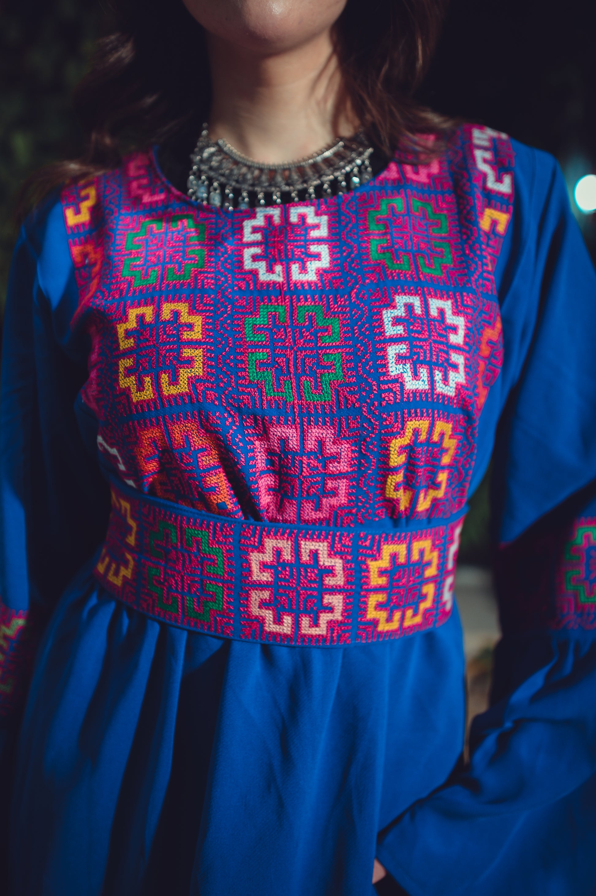 A regal and radiant piece that fuses tradition with modern grace. This flowing electric blue dress is adorned with vibrant Palestinian hand embroidery (tatreez) in radiant shades of magenta, orange, green, and yellow — forming bold, geometric motifs across the chest, cuffs, and wide waist panel.